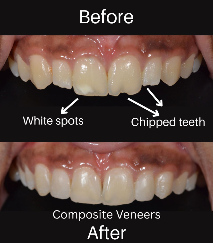 Chips , Cracks, front teeth gaps , receding gums space closures can be quickly fixed with composite veneers/ teeth bonding .